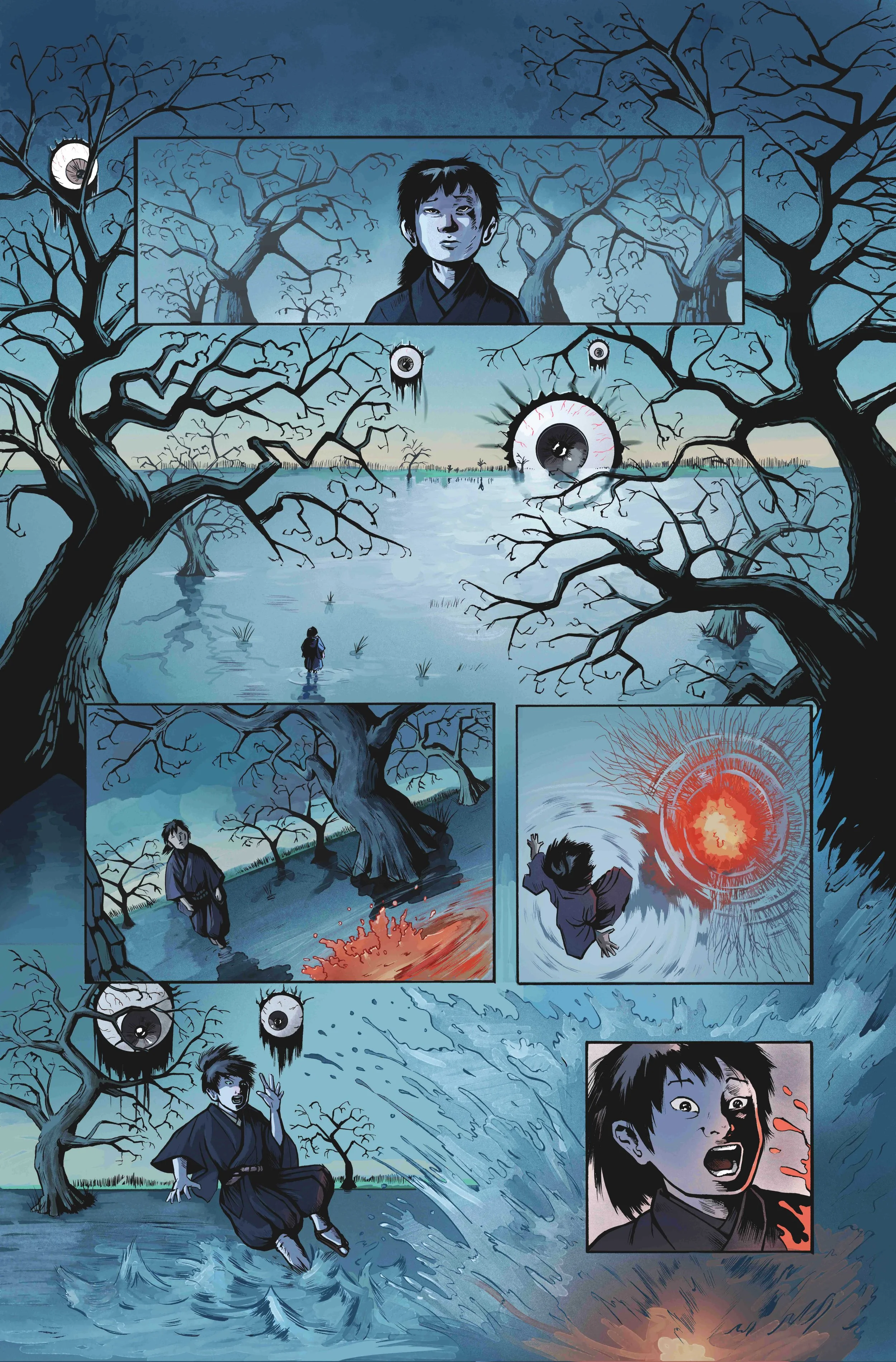This comic book opens up to a strange nightmare world where a boy goes into endless shallow waters. The sky above looks like shards of broken glass, with his eyes bulging and bloodshot watch whatever he does. Suddenly, the water bubbles, revealing a dark figure emerging from the depths. It cuts to a man waking up from this recurring nightmare and wondering what it could mean. The next scene takes us to a small village destroyed by an unknown force. A samurai visits the ruins and finds his wife dead on the floor, her soul crushed by a superhero. Terrified, he confronts the villain of the story, but before he can attack him, a giant hand reaches out from behind him, cracking his head like a grape, revealing a blood-spattered title.